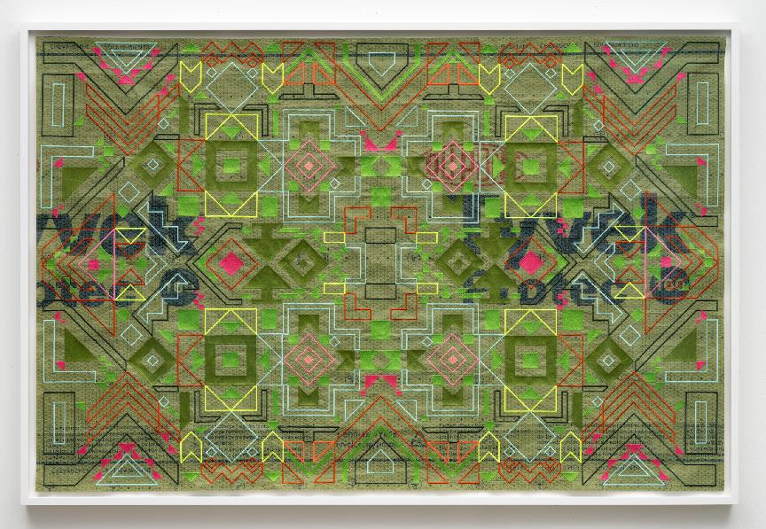 Caroline Monnet, Sweetgrass. Embroidery on roof underlayment, 46 1/2 x 69 1/2 inches, acquired by the Doris McCarthy Gallery, University of Toronto Scarborough.